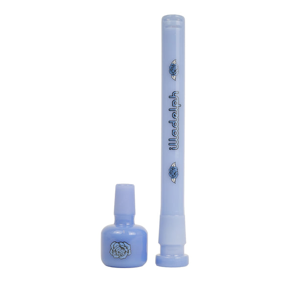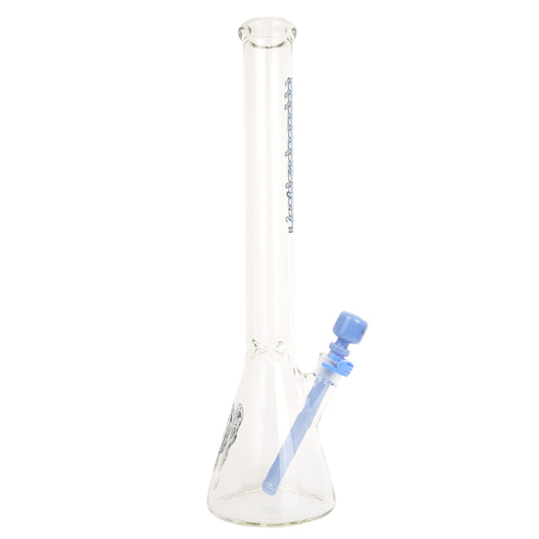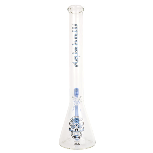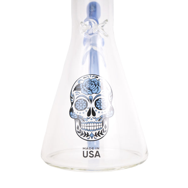 ARTIST: IlladelphHEIGHT: 19"BASE DIAMETER: 5"JOINT SIZE: 14mm 45ºCOLORS: Clear, Blue Day of the Dead Downstem, Blue Label